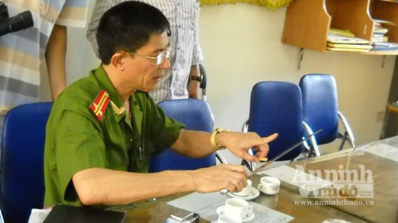 Trung tá Nguyễn Duy Sáng (CAH Đan Phượng) kiểm tra vết máu còn lại trên con dao tang vật