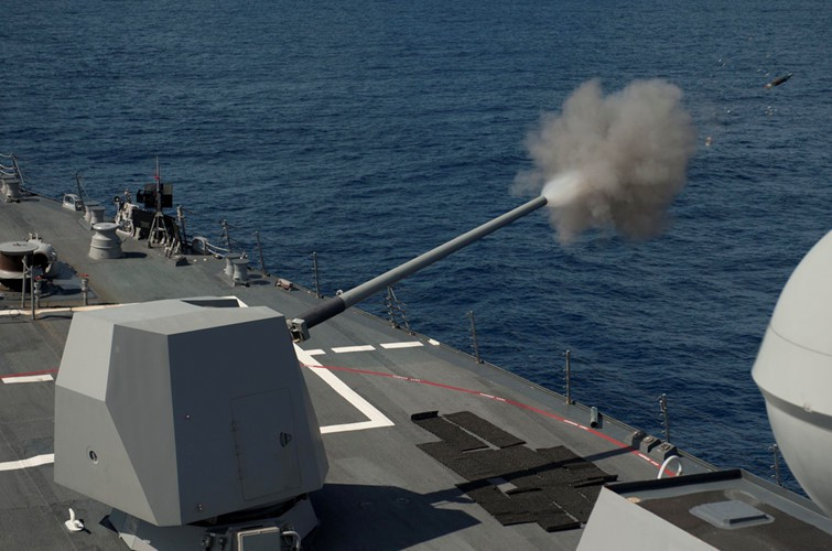 ANTD.VN - Tuần dương hạm USS Bunker Hill (CG-52) thuộc lớp Ticonderoga được trang bị hai khẩu hải pháo Mk-45 với cỡ nòng lên tới 127mm.