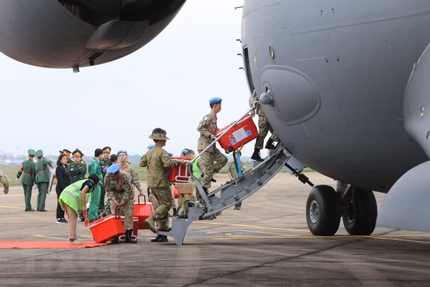 ANTD.VN - Các cán bộ, nhân viên Bệnh viện Dã chiến cấp 2 số 2 rời Hà Nội bằng máy bay vận tải quân sự Boeing C-17 Globemaster của Không quân Hoàng gia Australia, lên đường đến Nam Sudan thực hiện nhiệm vụ hòa bình của Liên hợp quốc.
