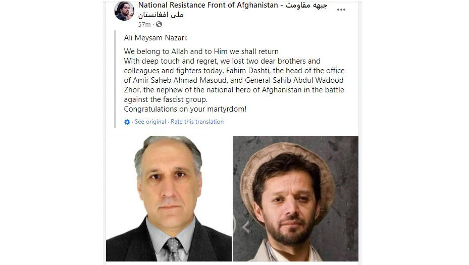 ANTD.VN - Lãnh đạo cơ quan đối ngoại của Mặt trận Kháng chiến Quốc gia Afghanistan (FANR), ông Fahim Dashti đã thiệt mạng trong một cuộc giao tranh với Taliban, tại thung lũng Panjshir vào ngày 5/9/2021.