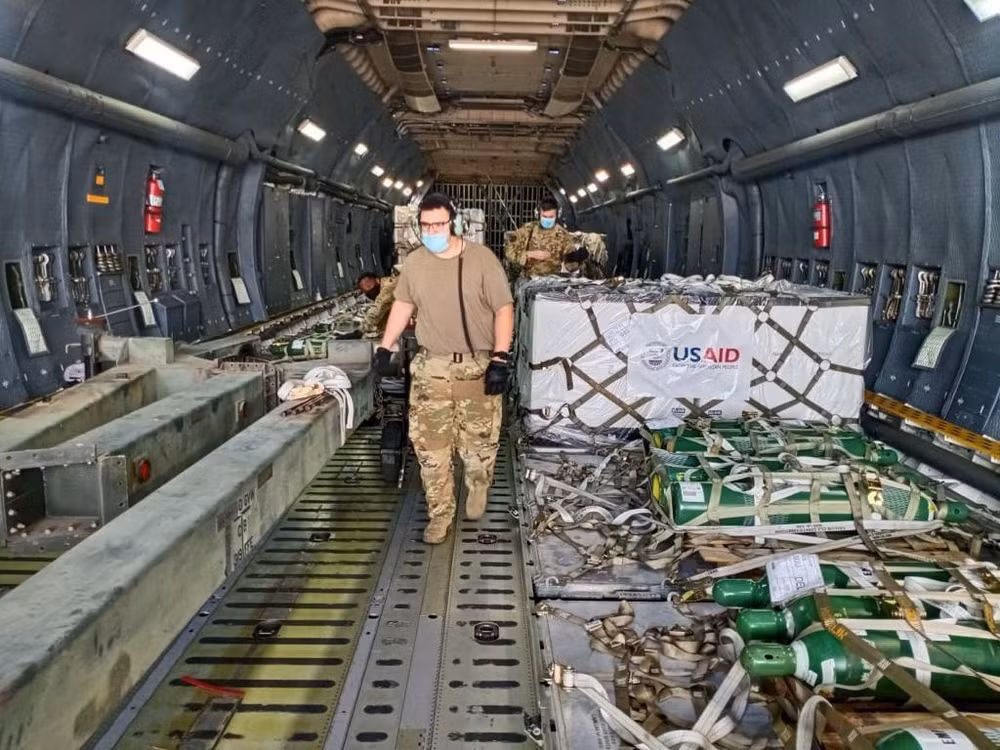 ANTD.VN -  Lô hàng đầu tiên với 440 bình dưỡng khí, 960.000 bộ xét nghiệm Covid-19, 100.000 khẩu trang N95, cùng nhiều loại vật tư, thiết bị y tế khác đã được máy bay vận tải khổng lồ C-5M Mỹ đưa tới Ấn Độ.
