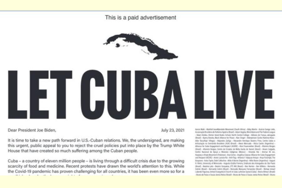 ANTD.VN - Trong bối cảnh quan hệ giữa Cuba và Mỹ đang nóng lên, tờ New York Times đã công bố một lá thư của những người tiến bộ trên khắp thế giới trên kêu gọi Tổng thống Mỹ Joe Biden hủy bỏ lệnh trừng phạt của người tiền nhiệm Donald Trump đã áp đặt lên Havana, với nhan đề: “Hãy để Cuba sống!”.