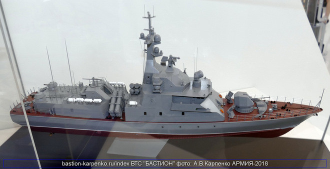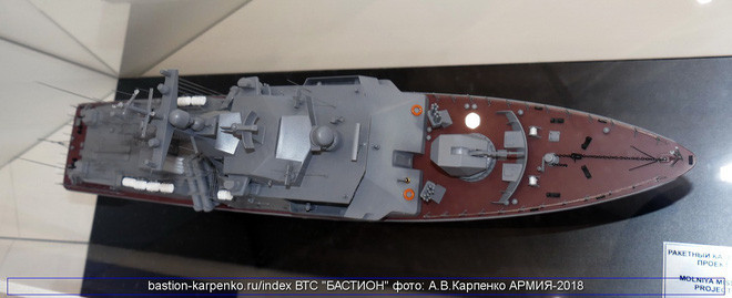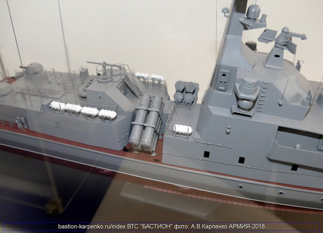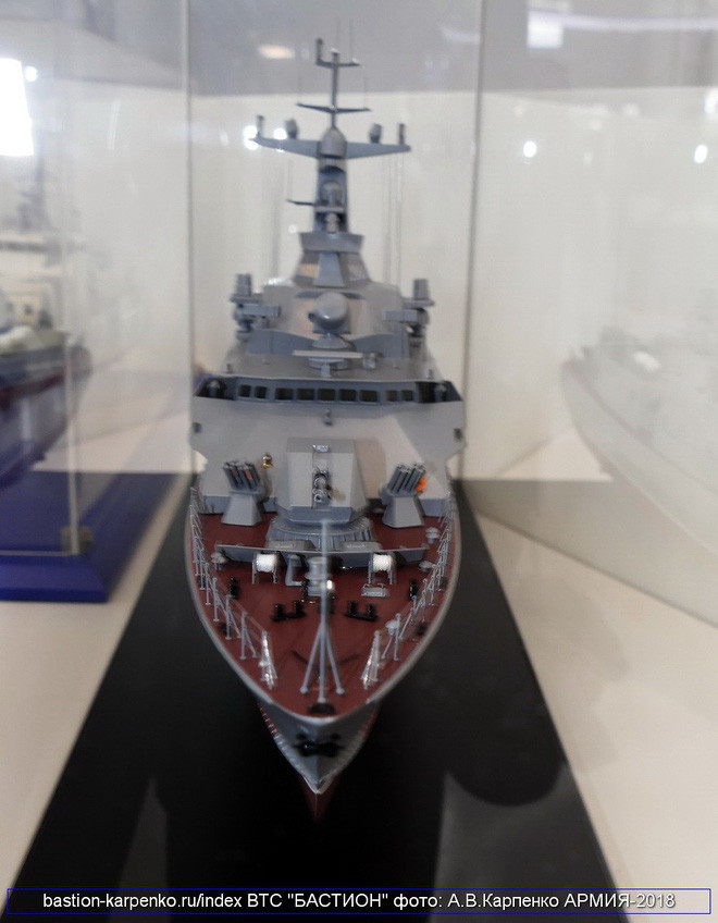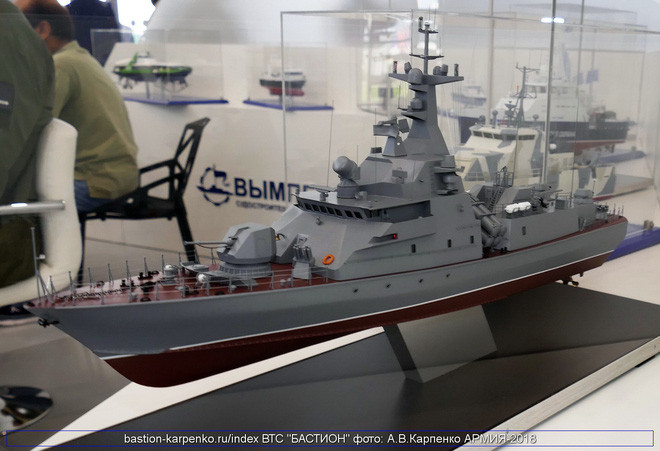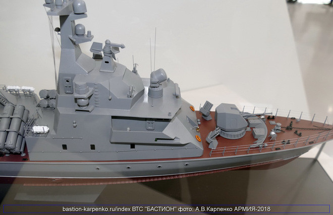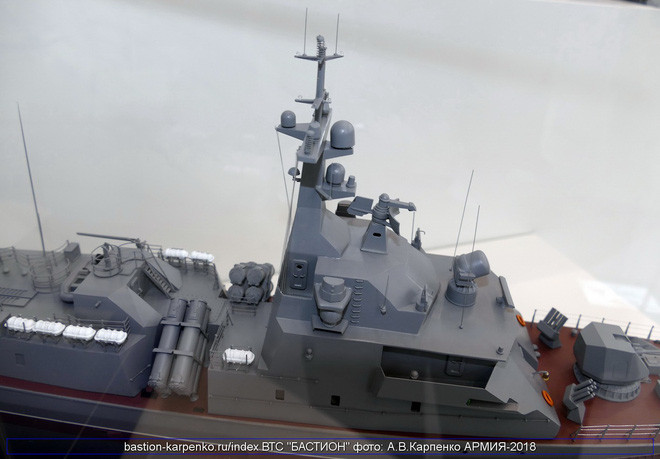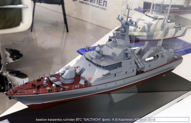 ANTD.VN - Trong khuôn khổ Triển lãm quân sự quốc tế Army 2018, Nga đã lần đầu tiên trưng bày mô hình chi tiết của tàu hộ vệ tên lửa cỡ nhỏ Molniya 1241.8 nâng cấp.