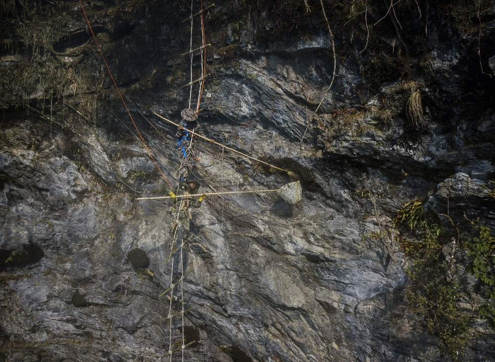 ANTD.VN - Việc thu thập mật ong hoang dã trên vách núi đá ở tỉnh Vân Nam, Trung Quốc diễn ra vô cùng nguy hiểm. Những người thợ phải đối mặt với bầy ong và bị đốt liên tục khi treo mình trên thang dây.