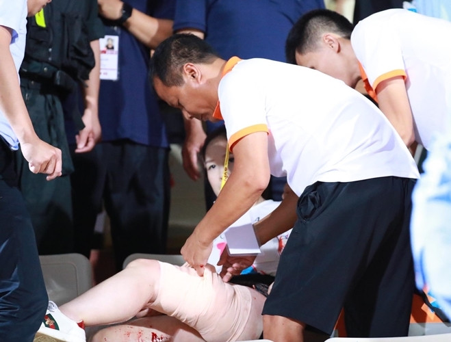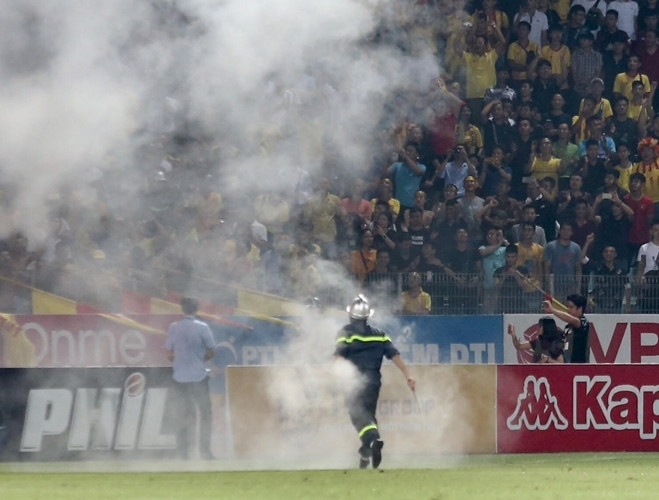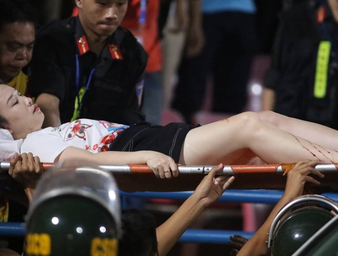 [ẢNH] Pháo sáng ném loạn xạ trên sân Hàng Đẫy, CĐV nữ đi cấp cứu