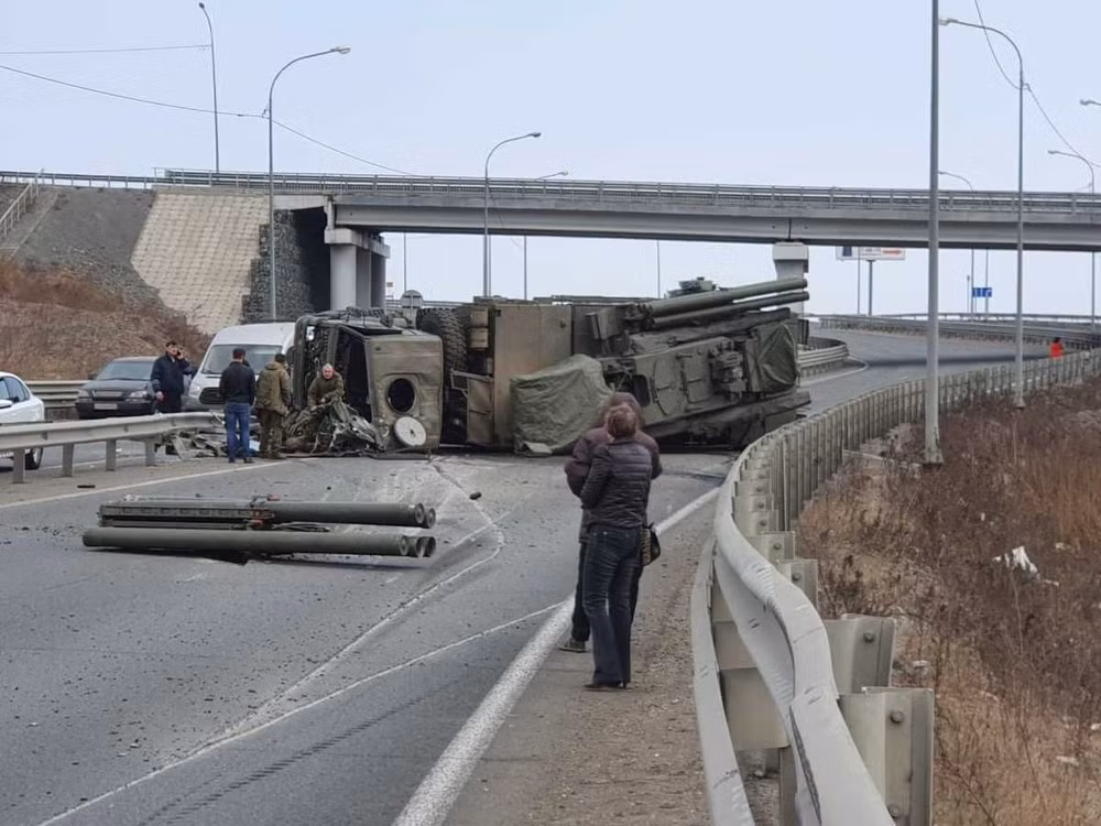 [ẢNH] Sau T-72B và Pantsir-S1, đến lượt pháo tự hành 2S7 Pion Nga đổ lật nhào khi hành quân