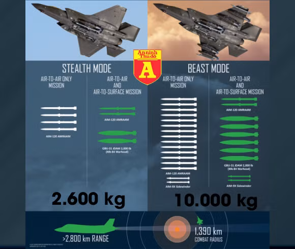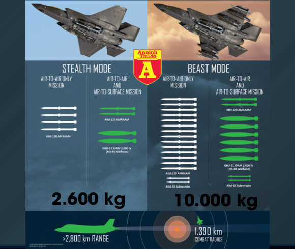 ANTD.VN - Mỹ đã thử nghiệm thành công F-35 ở chế độ “dã thú”, theo đó máy bay có thể mang theo 10 tấn vũ khí gồm bom và tên lửa. Với tải trọng vũ khí này, chiến đấu cơ F-35 Mỹ đã vượt xa cả Su-35 và Su-57 (ở chế độ không tàng hình) vốn chỉ có khả năng mang khoảng 8 tấn vũ khí.