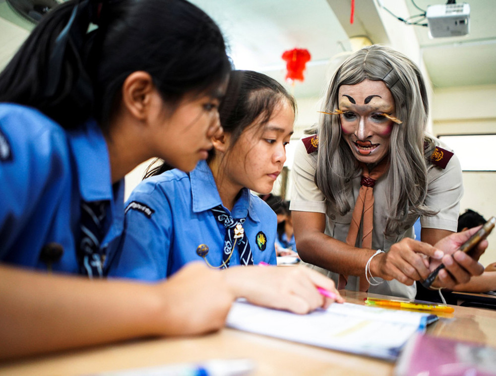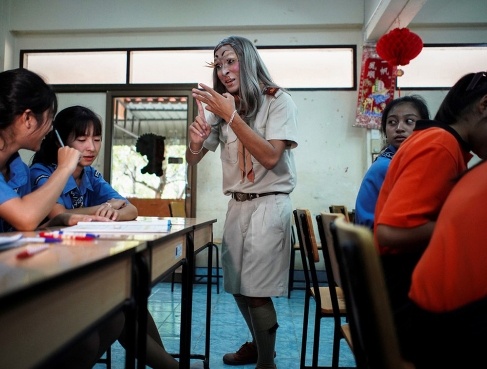 ANTD.VN - Thầy giáo tiếng Anh Theeraphong Meesat “táo bạo" áp dụng phương pháp đặc biệt giúp học sinh thoải mái và hứng thú hơn với môn học. Với lối trang điểm đậm, đội mái tóc giả cùng dáng đi catwalk điệu nghệ, thầy Theeraphong Meesat hiện được cộng đồng mạng gọi là "thầy giáo độc lạ nhất Thái Lan".