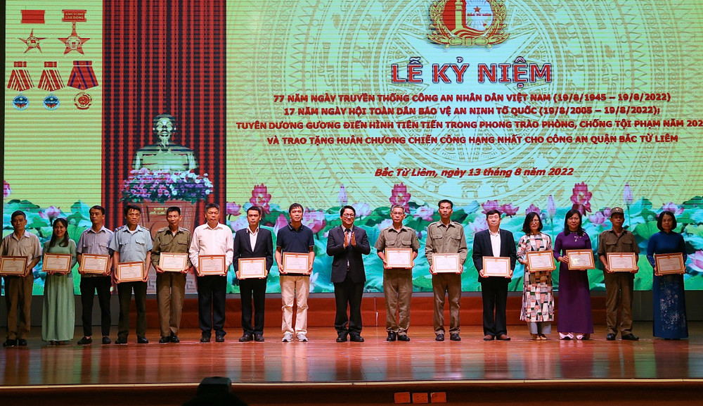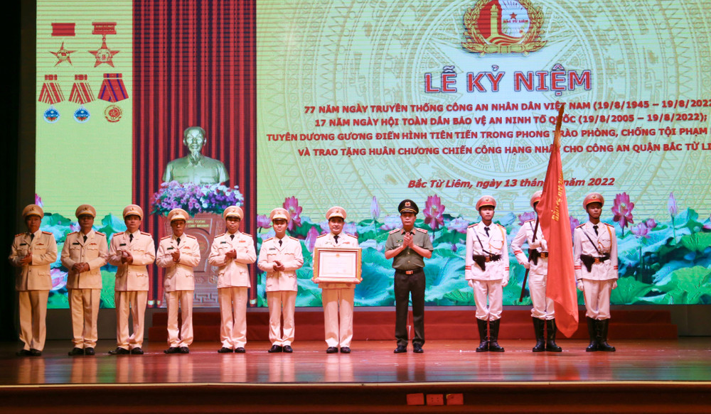 ANTD.VN - Ngày 13-8, UBND quận Bắc Từ Liêm (Hà Nội) trang trọng tổ chức Lễ đón nhận Huân chương chiến công hạng Nhất trao tặng Công an quận và tuyên dương "Gương điển hình tiên tiến trong phong trào phòng, chống tội phạm năm 2022".