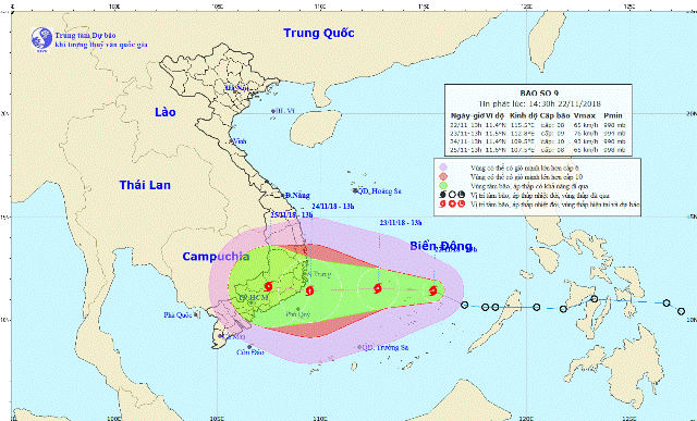Theo dự báo của Trung tâm Dự báo khí tượng thủy văn quốc gia, bão số 9 sẽ tiếp tục mạnh thêm 1-2 cấp, và hướng vào các tỉnh Nam Trung bộ, từ Bình Định đến Bình Thuận.