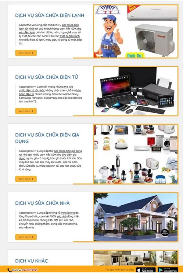 Ứng dụng Ong Thợ sẽ mang tới những gia đình bị hỏng thiết bị đồ dùng gia đình một cách đầy đủ nhất. Quý vị có thể tìm hiểu thêm tại website chính thức https://appongtho.vn/