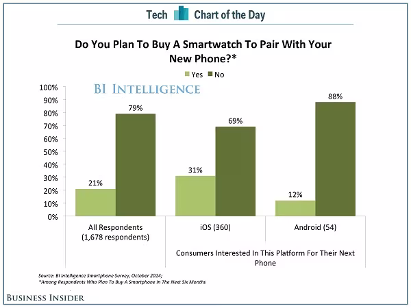 Dựa trên số liệu điều tra trực tuyến trên toàn cầu thu thập được trong tháng 10 năm 2014 và thứ hạng trên BI Intelligence cho thấy, khoảng một phần năm số người sở hữu điện thoại thông minh đang quan tâm đến việc kết nối smartwatch với điện thoại của họ - nhưng 31% số người được hỏi cho biết họ muốn có một chạy của Apple iOS so với 12% số người được hỏi quan tâm đến một smartwatch chạy hệ điều hành Android.