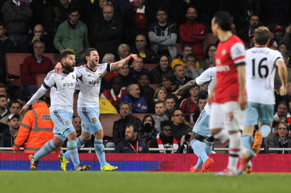 Không thể tận dụng các cơ hội, Arsenal đã phải chịu sự trừng phạt. Phút thứ 40, trong một tình huống lộn xộn trước khung thành của Szczesny, Matthew Jarvis đã tận dụng thời cơ đánh đầu cận thành để đưa West Ham vươn lên dẫn trước.