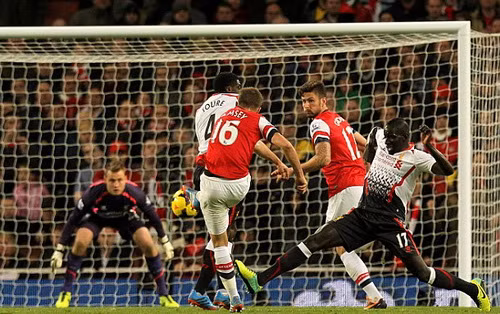 Với lợi thế sân nhà, các Pháo thủ thành London đã nhập cuộc mạnh mẽ hơn rất nhiều so với đội khách Liverpool. Hàng tiền về gồm các cầu thủ Ramsey, Arteta, Ozil, Cazorla và Rosicky tiếp tục cho thấy sự xuất sắc của mình khi hoàn toàn chủ khu vực giữa sân.