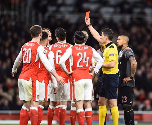 Mặc dù vậy, cơn ác mộng trên đất Đức đã lặp lại với Arsenal. Quyết định thổi penalty gây tranh cãi của trọng tài người Hy Lạp, Tasos Sidiropoulos đánh dấu bước ngoặt của trận đấu vào đầu hiệp 2. Không chỉ tận dụng thành công để ghi bàn quân bình tỷ số 1-1 do công của Robert Lewandowski, Hùm xám còn được chơi hơn người từ phút 55 vì đội trưởng của Arsenal, Laurent Koscielny phải nhận thẻ đỏ rời sân vì lỗi phản ứng. Tại trận lượt đi, chấn thương của trung vệ người Pháp khiến Arsenal sụp đổ trong hiệp 2 và “Pháo thủ” vỡ trận ở Emirates khi ngôi sao này rời sân.