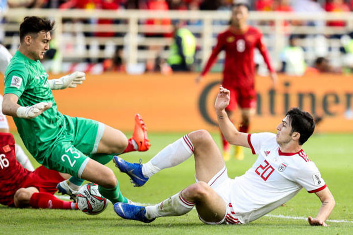 Sardar Azmoun (phải) đối mặt với Đặng Văn Lâm ở Asian Cup 2019