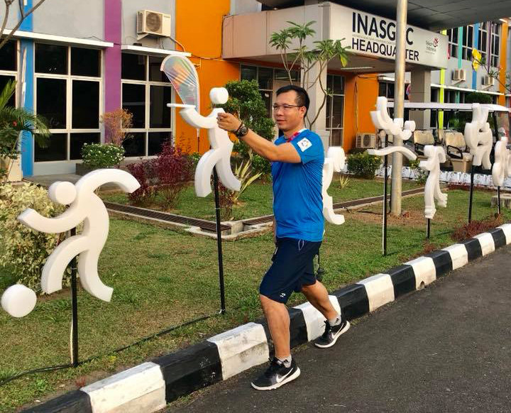 Hoàng Xuân Vinh đang có tâm lý thoải mái, sẵn sàng chinh phục HCV ASIAD. (Trong ảnh: Xạ thủ của Quân đội bắt chước mô hình của VĐV bắn súng trong khuôn viên làng thể thao Palembang - ảnh Nhung Nguyễn)