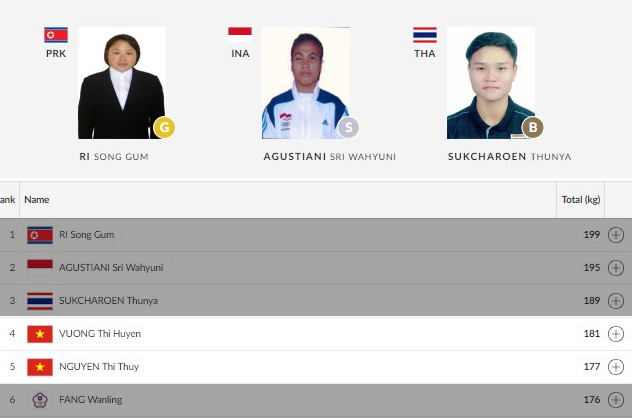 Thế nhưng kết quả này chỉ giúp hai VĐV Việt Nam lần lượt xếp hạng 4 và 5 chung cuộc. Ba VĐV giành huy chương có thành tích rất tốt, lần lượt là Ri Song Gum (CHDCND Triều Tiên, 199kg, HCV), Agustiani (chủ nhà Indonesia, 195kg, HCB) và Thunya (Thái Lan, 189kg, HCĐ).