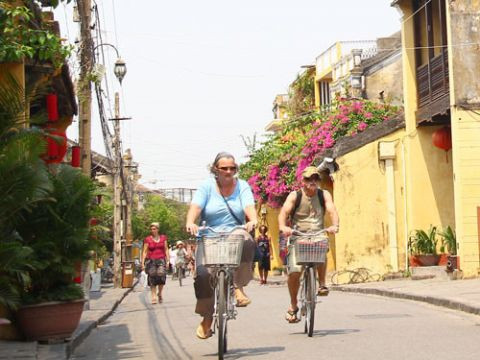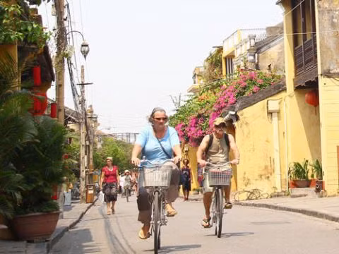 Du khách nước ngoài thong thả đạp xe dạo quanh phố cổ Hội An