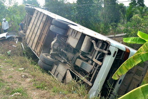 Xe chở công nhân do tài xế tên Ngô Công Bình điều khiển trật bánh xuống lề, lật nghiêng khiến 10 người bị thương.
