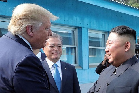 Tổng thống Mỹ Donald Trump (trái), nhà lãnh đạo Triều Tiên Kim Jong-un (phải) và Tổng thống Hàn Quốc Moon Jae-in (giữa) trong cuộc gặp tại Khu phi quân sự (DMZ) ngày 30-6 vừa qua