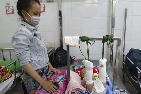 Sau đó, cháu Khôi được đưa đến bệnh viện trong tình trạng bị nhiều vết thương ở chân và mặt. Nạn nhân được xác định tổn thương 37%. Bé bị gãy chân nhưng không thể phẫu thuật do còn bị nhiều tổn thương khác và xuất huyết não. Các chấn thương cho thấy bé bị bạo hành nên bác sĩ báo với cảnh sát.