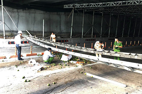 Đến 8h30 sáng nay, cơ quan chức năng xác nhận, một xe tải chở cam chạy phía trên đầu hầm va quẹt làm giàn giáo này đổ xuống.