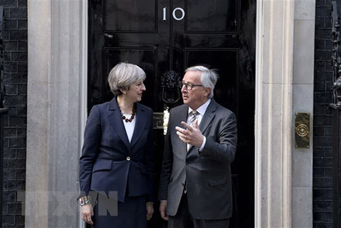 Chủ tịch Ủy ban châu Âu (EC) Jean-Claude Juncker (phải) trong một cuộc gặp Thủ tướng Anh Theresa May. (Nguồn: AFP/TTXVN)
