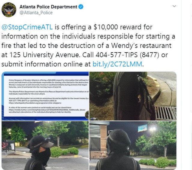 Cuối tuần qua, bầu không khí căng thẳng ở Atlanta leo thang sau vụ một công dân da màu 27 tuổi bị cảnh sát bắn chết hôm 12-6. Nhà hàng đồ ăn nhanh Wendy - hiện trường vụ việc - đã trở thành nơi người biểu tình trút giận khi họ châm lửa đốt cháy rụi. Giới chức Atlanta sau đó đã công bố các bức ảnh của một nữ nghi phạm và treo thưởng cho thông tin giúp họ có thể bắt được người này.