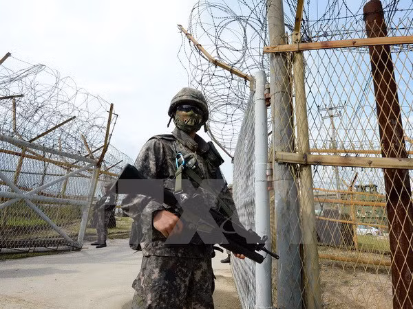 Binh sỹ Hàn Quốc gác gần hiện trường vụ nổ mìn tại khu phi quân sự giữa hai miền Triều Tiên - Ảnh TTXVN