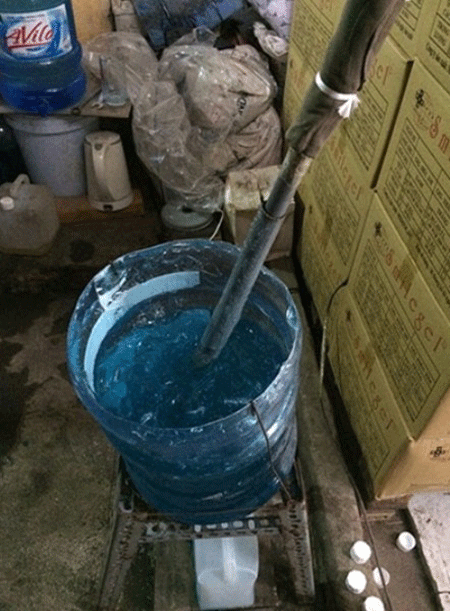 *Lực lượng chức năng liên ngành TP Hà Nội vừa bất ngờ kiểm tra kho hàng của Công ty TNHH Thiết bị hóa chất và hóa mỹ phẩm, nằm trên đường Tựu Liệt, huyện Thanh Trì, Hà Nội, phát hiện công nhân của công ty này đang tự pha chế Gel Smilesonog, hóa chất chuyên dùng trong siêu âm.