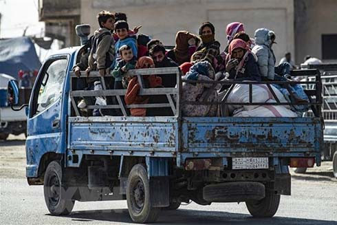 Người dân Syria sơ tán tránh chiến sự tại thị trấn Ras al-Ain ngày 15-10-2019. (Nguồn: AFP/TTXVN)