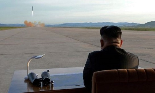 Lãnh đạo Triều Tiên Kim Jong-un quan sát vụ phóng tên lửa Hwasong-12 hồi năm 2017. Ảnh: KCNA.