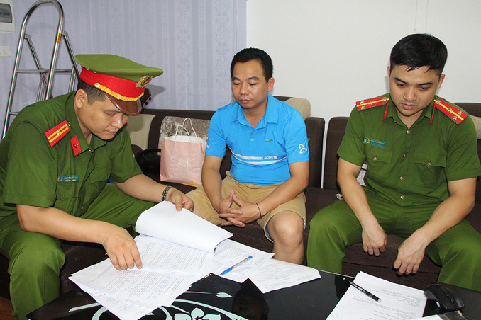 Bị can Kim Văn Bốn (ở giữa) lúc làm việc với công an