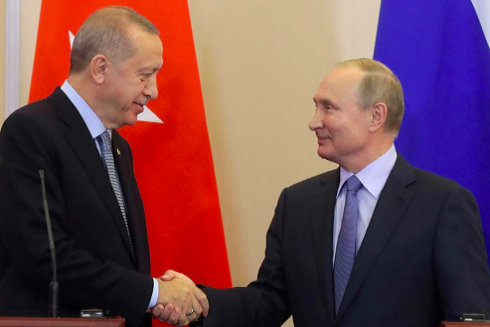 Tổng thống Nga Vladimir Putin (phải) bắt tay người đồng cấp Thổ Nhĩ Kỳ Recep Tayyip Erdogan trong cuộc họp báo tại Sochi hôm 22-10