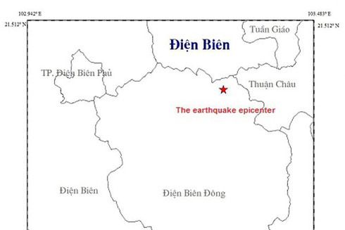 Vị trí xảy ra động đất chiều 22-6 tại Điện Biên. (Ảnh: Viện Vật lý địa cầu)