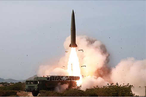 Một vụ phóng thử vũ khí chiến thuật của Triều Tiên tại địa điểm không xác định ( ảnh do Hãng thông tấn Trung ương Triều Tiên đăng phát ngày 5-5-2019): Ảnh: AFP/TTXVN