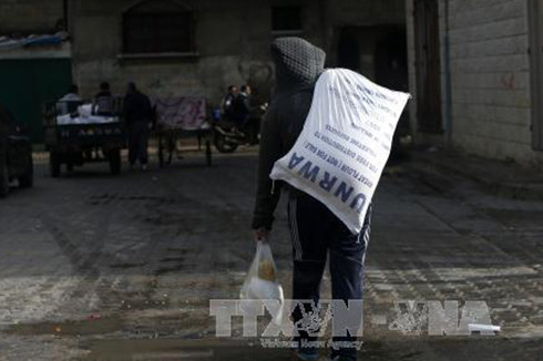 Người dân Palestine chuyển lương thực cứu trợ bên ngoài trung tâm phân phối lương thực của LHQ tại Gaza. (Ảnh: AFP/TTXVN)
