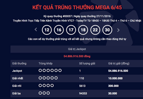 Tại kỳ quay mở thưởng số 57 ngày 27-11, Công ty Vietlott tiếp tục tìm ra chiếc vé may mắn trúng độc đắc trị giá 54,886 tỷ đồng. Chiếc vé trúng lần này có dãy số 12 - 16 - 17 - 18 - 22 - 30. Không chỉ giải đặc biệt, kỳ quay còn tìm ra 110 giải trúng 10 triệu đồng và gần 10.000 chiếc vé khác trúng giải 300.000 đồng và 30.000 đồng.