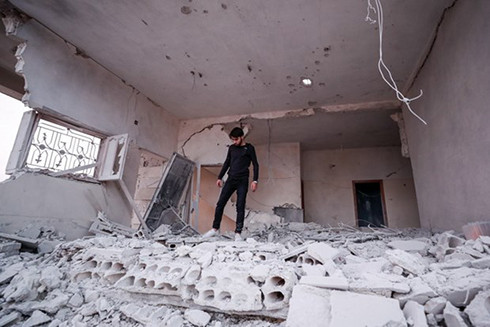 Hiện trường đổ nát sau một vụ không kích tại làng al-Haraki, tỉnh Idlib của Syria