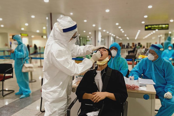 Nhân viên y tế tiến hành lấy mẫu bệnh phẩm của hành khách tại sân bay