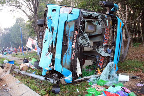Sau cú đâm mạnh, hai xe đều văng xa, hư hỏng nặng. Trong đó, ôtô khách lao vào lùm cây ven đường, lật ngang. Hành khách trên xe hoảng loạn kêu cứu, một số người đập vỡ cửa kính tự thoát được ra ngoài.