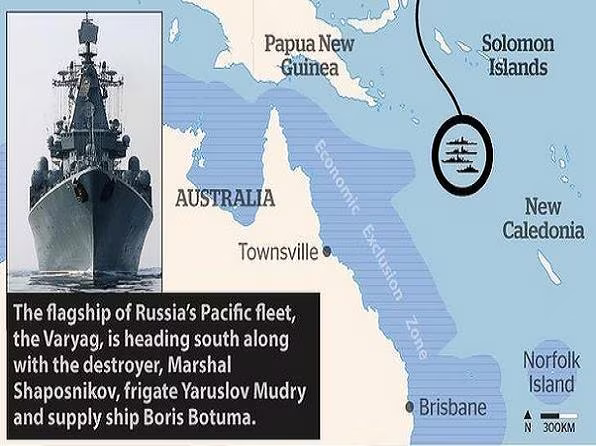 Bộ Quốc phòng Australia cho biết, đội tàu Nga gồm các tàu chiến thuộc hạm đội Thái Bình Dương, dẫn đầu là tàu tuần dương Varyag, theo sau là tàu khu trục Marshal Shaposhnikov, tàu kéo cứu hộ Fotiy Krylov (một trong những tàu kéo mạnh nhất trên thế giới) và cuối cùng là tàu chở dầu Boris Butoma.