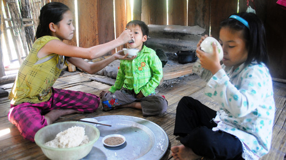 Trong lúc tôi đang ngồi nghe cô bé Đòa kể chuyện cuộc sống của 3 chị em, thì đứa em út Ngân Thị Huyện (5 tuổi) đi chơi với các bạn ở dưới trường lò dò lên. Thấy người lạ, bé Huyện len lén đến cạnh người chị cả túm áo của chị giật giật, rồi nói với chị bằng tiếng Thái: “Noọng xếp toọng”. Khi tôi hỏi cô giáo Quế xem bé Huyện nói gì, thì mới hay bé Huyện kêu đói, đòi ăn cơm. Cả tôi và cô giáo Quế phải giục Đòa cho em ăn cơm, Đòa mới đồng ý dọn bữa. Mâm cơm tối của ba chị em Đòa nhanh chóng dọn ra ở một góc lều. Mà gọi là “mâm cơm”, chứ thực ra, chỉ có vẻn vẹn một đĩa muối vừng, một tô canh rau dớn và một rá cơm được nấu từ sáng để phần buổi tối.
