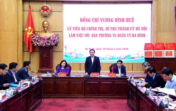 Sáng nay, 10-3, Ủy viên Bộ Chính trị, Bí thư Thành ủy Hà Nội Vương Đình Huệ đã làm việc với Ban Thường vụ Quận ủy Ba Đình. Cùng dự có các Ủy viên Trung ương Đảng: Phó Bí thư Thường trực Thành ủy Ngô Thị Thanh Hằng; Phó Bí thư Thành ủy, Chủ tịch UBND TP Nguyễn Đức Chung.