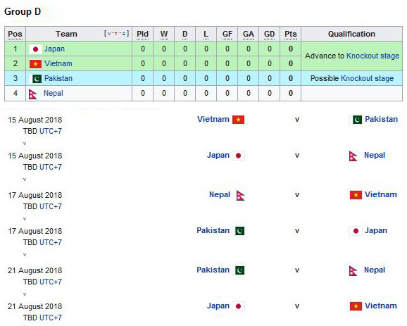 Lịch thi đấu bảng D môn bóng đá nam ASIAD 2018