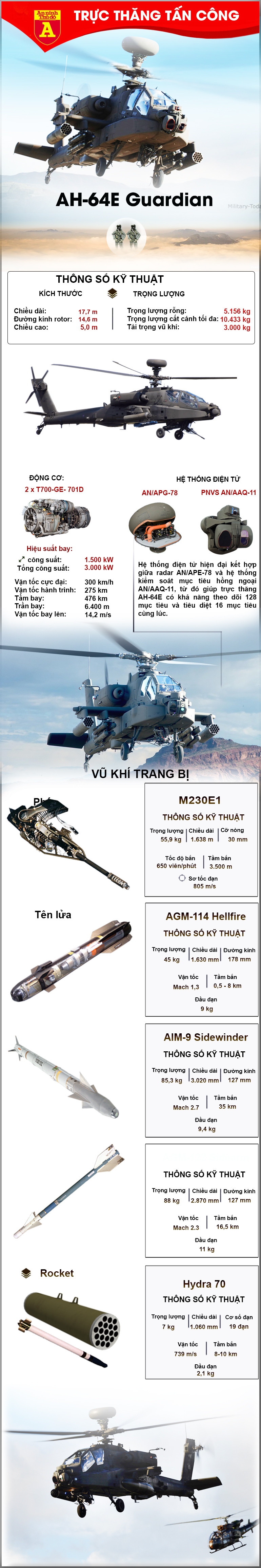 Trực thăng AH-64 Apache được phát triển từ những năm 1970, lục quân Mỹ biên chế mẫu máy bay này năm 1986. Biến thể AH-64E, từng được gọi là AH-64D Block III. So với những phiên bản trước, AH-64E được nâng cấp cả về hệ thống động cơ, điện tử và vũ khí.