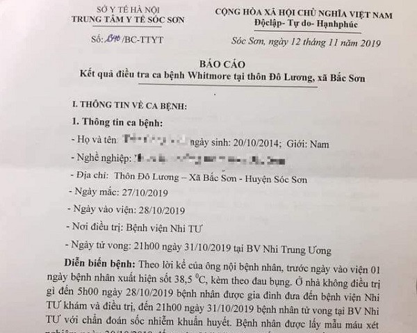 Tối 31-10, bệnh nhi tử vong tại bệnh viện với chẩn đoán sốc nhiễm khuẩn huyết. Mẫu máu lấy xét nghiệm của bệnh nhân có kết quả dương tính với loại sinh khuẩn Burkholderiapseudomallei (còn gọi là vi khuẩn whitmore). Trước đó, bé V. không có tiền sử bệnh mạn tính.