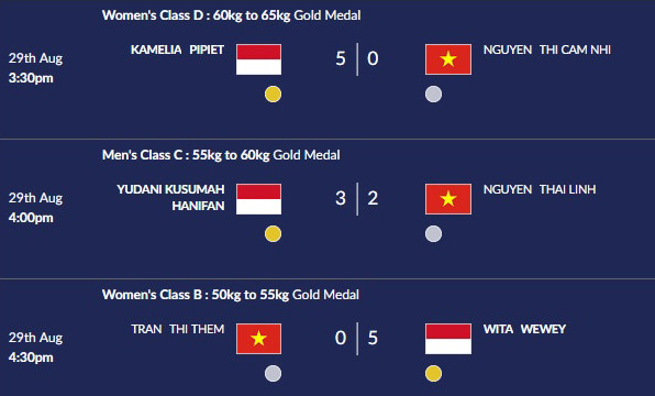 Ở chung kết nội dung dưới 65kg nữ, võ sỹ Nguyễn Thị Cẩm Nhi thua 0-5 trước Pipiet (Indonesia). Ngay sau đó đến lượt Nguyễn Thái Linh thua sát nút 2-3 trước Hanifan (cũng của Indonesia) tại chung kết hạng dưới 60kg nam.