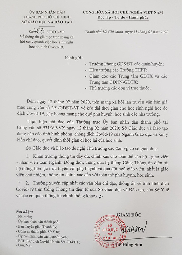 Ngày 13/2, Giám đốc Sở GD-ĐT TP Hồ Chí Minh đã gửi thông báo đến tất cả các trường học trên địa bàn về thông tin giả mạo trên mạng xã hội quanh việc học sinh nghỉ học do dịch COVID-19.